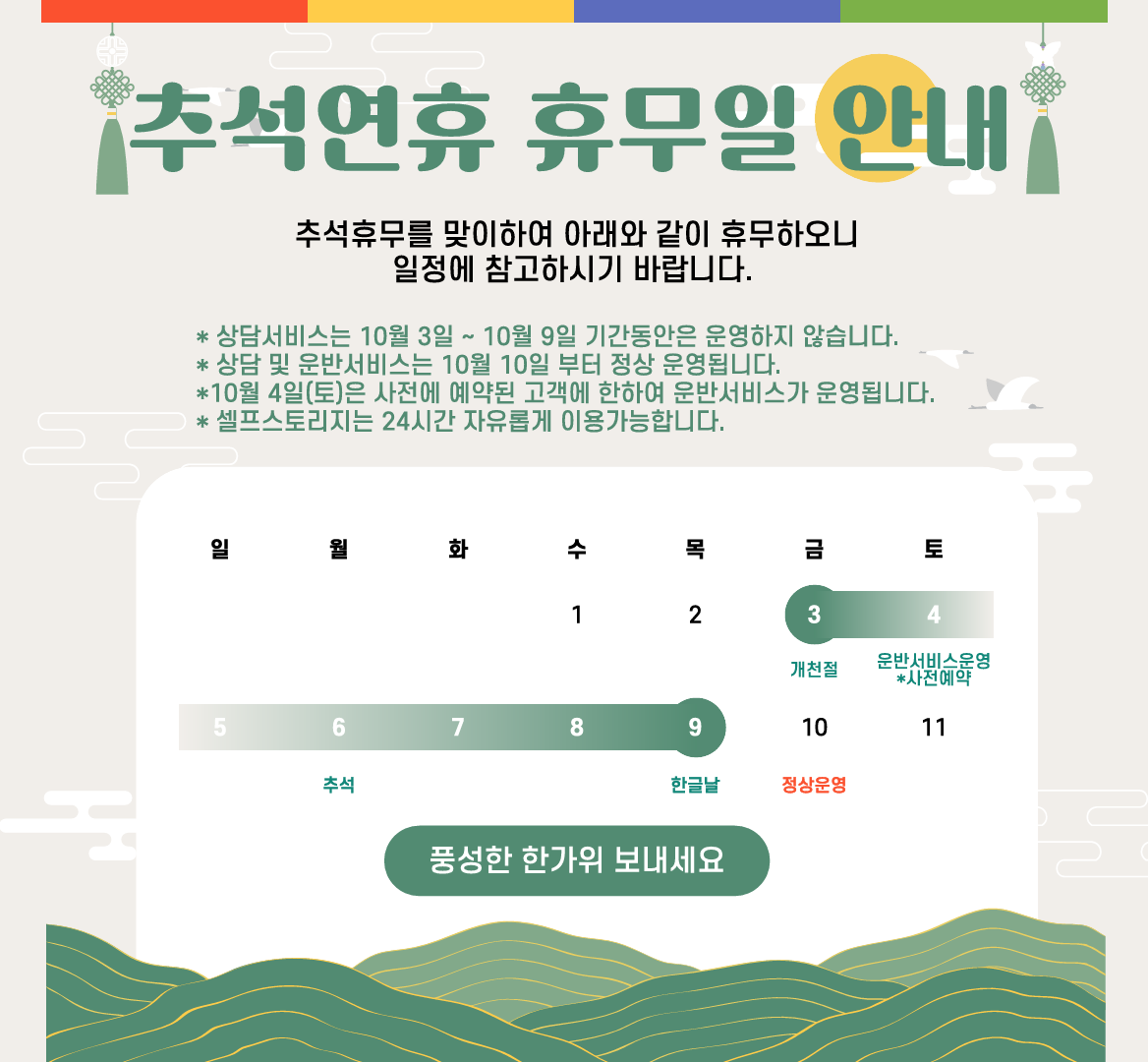 2025년 10월 3일(금)~ 10월 9일(목)은 개천절 및 추석 연휴로 운영 안내드립니다